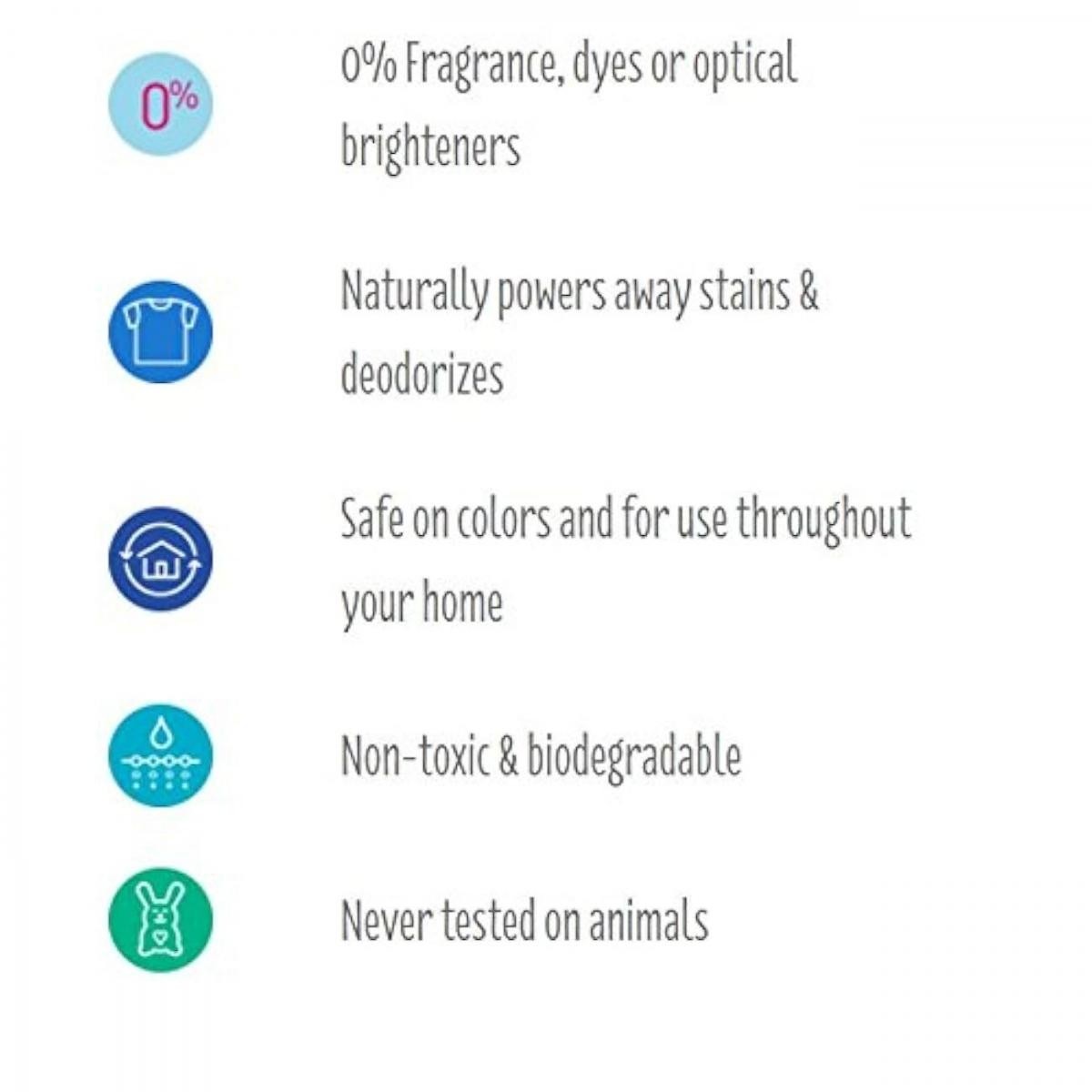 Features:Non toxic & biodegradable.Safe on colors and for use throughout your home.Powers away stains & deodorizes.0% fragrance, dyes or optical brighteners.