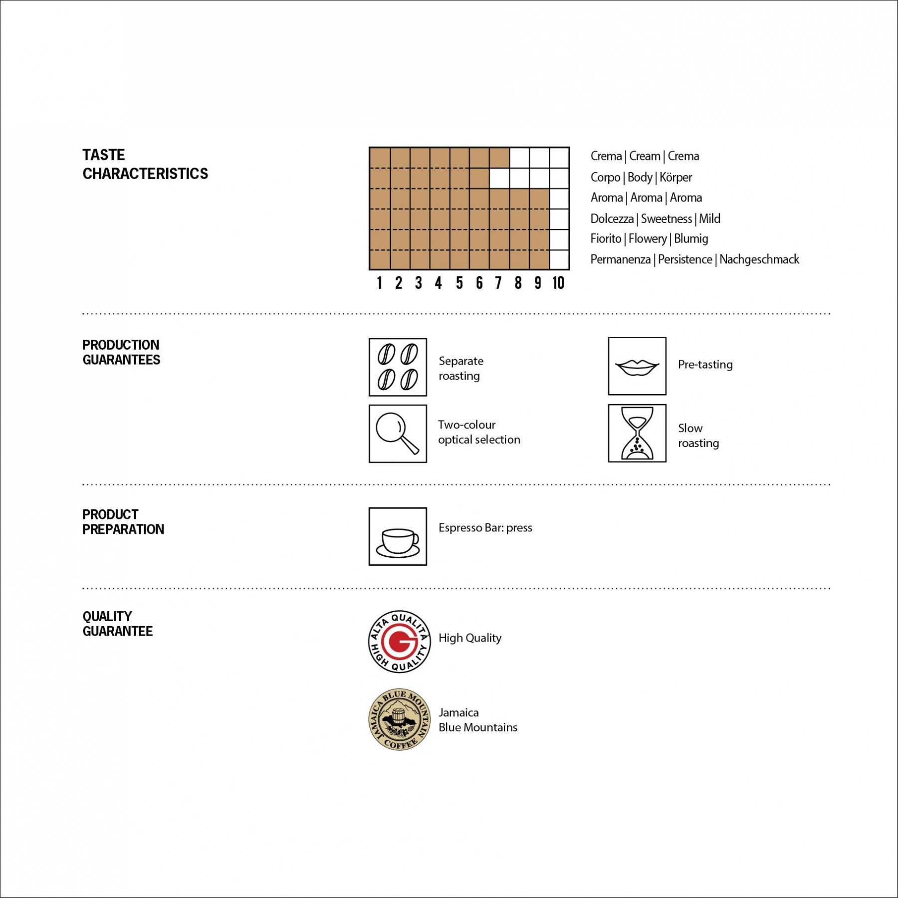 The renowned JaBlMo® comes from Central and South America, includes the exquisite Huehuetenango coffee beans from the green highlands of Guatemala, exalted by the unique aroma of the precious Jamaica Blue Mountain®. An unforgettable pleasure dedicated to coffee lovers.