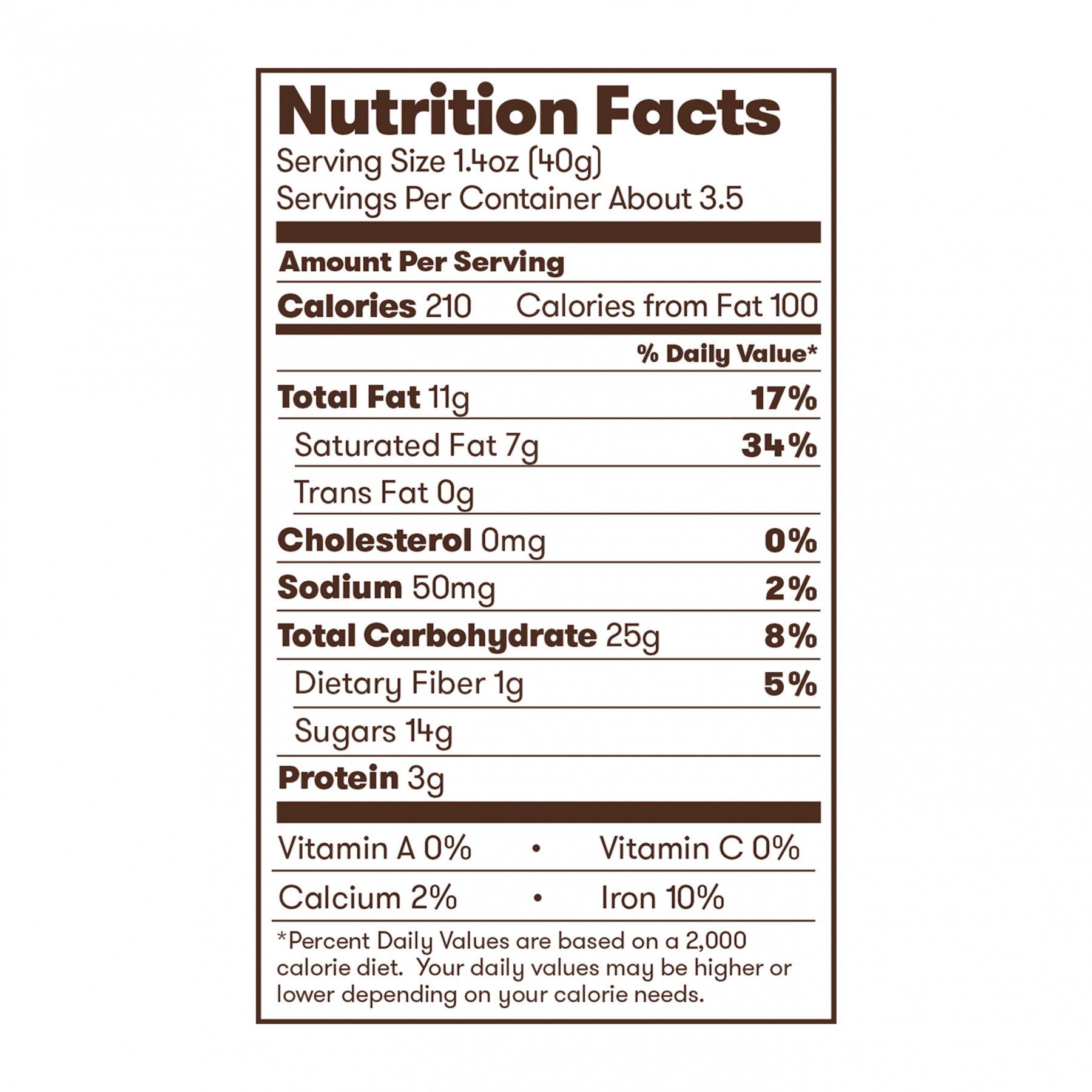 黑朱古力 [朱古力*,糖*,可可脂*,牛奶脂肪,卵磷脂 (大豆),香草],杏仁,椰子,糖,米糖漿,海鹽。